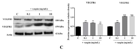 Vaspin is linked with angiogenesis in human portal tracts and lobules in chronic hepatitis liver [22]. Vascularization is an essential process for proper CL formation [1]. Therefore, we investigated the dose-dependent (0.1, 1, and 10 ng/mL) effect of vaspin on luteal cells angiogenesis. We showed that vaspin significantly upregulated mRNA expression of VEGFA (2.0-, 1.8-, and 1.9-fold) at all investigated doses, FGF2 (2.0- and 1.9-fold) at 1 and 10 ng/mL, and ANGPT1 (2.5-fold) at 0.1 ng/mL compared to the control (* p < 0.05, ** p < 0.01, *** p < 0.001, Figure 1A). Similarly, enhancement in angiogenic factor secretion after vaspin treatment were observed at 1 and 10 ng/mL in VEGFA (47.51 ± 2.13 and 61.92 ± 2.75 vs. 34.77 ± 1.51 in control), at 0.1 and 1 ng/mL in FGF2 (8.86 ± 0.38 and 8.81 ± 0.53 vs. 7.1 ± 0.15 in control), and at all doses in ANGPT1 (25.37 ± 0.65, 25.27 ± 0.57, and 27.41 ± 0.81 vs. 21.34 ± 0.53 in the control) (* p < 0.05, ** p < 0.01, *** p < 0.001, Figure 1B). Additionally, we found a stimulatory effect of vaspin on the protein expression of VEGFR1 and VEGFR2 receptors at all examined doses (** p < 0.01, *** p < 0.001, Figure 1C), indicating vaspin as a new regulator of luteal cell angiogenesis.