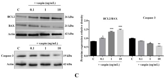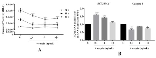Vaspin is known for its antiapoptotic properties in porcine granulosa cells [24]. Hence, we examined the dose- (0.1, 1 and 10 ng/mL) and time- (24 h to 72 h) dependent effect of vaspin on luteal cell apoptosis. As shown in Figure 2, we observed that vaspin at all investigated doses significantly decreased caspase 3 and 7 activity after 24 h and 48 h of incubation, while had no effect after 72 h of incubation (** p < 0.01, *** p < 0.001, Figure 2A). Furthermore, after 24 h of incubation, vaspin at 0.1 and 1 ng/mL significantly increased the ratio of BCL2/BAX mRNA (1.6- and 1.4-fold), while at 0.1 and 10 significantly inhibited caspase 3 mRNA expression (1.7- and 1.4-fold) compared to the control (* p < 0.05, ** p < 0.01, *** p < 0.001, Figure 2B). Interestingly, a similar effect of vaspin was observed for protein level, upregulated ratio of BCL2/BAX at all investigated doses, while at 1 and 10 ng/mL, there was an inhibitory effect on cleavage caspase 3 protein expression (* p < 0.05, ** p < 0.01, *** p < 0.001, Figure 2C), suggesting that vaspin participates in luteal cell function maintenance.