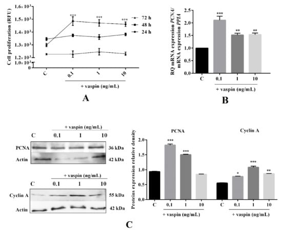 Dose- and time-dependent effect of vaspin on luteal cell proliferation. The cells were treated with 0.1, 1, and 10 ng/mL of vaspin for 24 h to 72 h, after which cell proliferation (A) was analyzed using the alamarBlue assay. Additionally, cells were incubated for 24 h with 0.1, 1, and 10 ng/mL of vaspin and then real-time PCR and western blot analysis were performed to determine PCNA (proliferating cells nuclear antigen) mRNA (B) and PCNA or cyclin A protein expression (C). Gene expression levels were normalized to cyclophylin A (PPIA), while proteins to actin. Experiments were independently performed and repeated four times (n = 4). The data were plotted as the means ± SEM. Significance between the control and vaspin treatments is indicated by * p < 0.05, ** p < 0.01, and *** p < 0.01; Control (C), Relative Fluorescence Units (RFU).