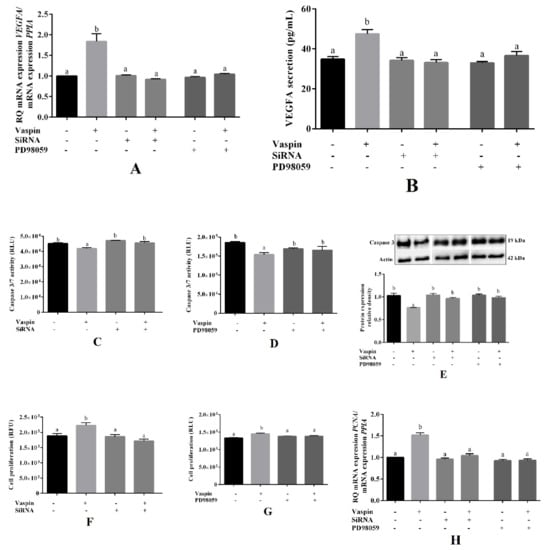 Involvement of the 78-kDa glucose-regulated protein (GRP78) receptor and mitogen activated kinase (MAP3/1) on the effect of vaspin on luteal cells. Cells were pretreated with GRP78 siRNA (2 nM) for 24 h or with PD98059 (5 μM) MAP3/1 kinase inhibitor for 1 h; afterward, vaspin (1ng/mL) was added for 24 h, then VEGFA (vascular endothelial growth factor) (A), VEGFA secretion (B), caspase 3 and 7 activity (C,D), caspase 3 protein level (E), cell proliferation (F,G), PCNA (proliferating cells nuclear antigen) mRNA expression (H) were determined by using real-time PCR, ELISA, Caspase-Glo 3/7 assay, western blot and alamarBlue assay. Gene expression levels were normalized to cyclophylin A (PPIA), while protein to actin. Experiments were independently performed and repeated four times (n = 4). The data were plotted as the means ± SEM. Significance between control and vaspin or inhibitors and vaspin + inhibitors treatments are indicated by different letters (p < 0.05); Control (C), Relative Fluorescence Units (RFU), Relative Luminescence Units (RLU), + with reagent, - without reagent.