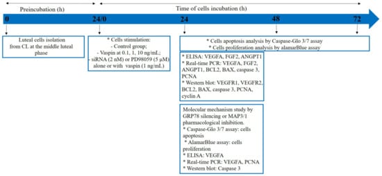 To investigate the molecular mechanism of vaspin action on luteal cell function, cells were incubated in M199 without FBS for 24 h and next pre-treated with GRP78 siRNA at 2 nM for 24 h. To investigate the involvement of MAP3/1 kinase, luteal cells cultured in M199 supplemented with 1% [v/v] FBS were pre-treated for 1 h with a pharmacological inhibitor of MAP3/1, PD98059, at a dose of 5 μM [21]. Subsequently, vaspin at a concentration of 1 ng/mL was added for the next 24 h and then the medium was stored at −20 °C for VEGFA secretion, while cells were washed in PBS and stored at −70 °C for VEGFA and PCNA expression or boiled in Laemmli buffer for 4 min for caspase 3 protein expression analysis. Additionally, to study cell proliferation, alamarBlue was added for 2 h or to evaluate cell apoptosis, Caspase-Glo 3/7 reagent was added for 1.5 h (Figure 5).