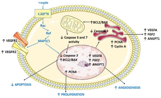 Model of vaspin regulatory action in porcine luteal cells. Vaspin stimulates angiogenesis and proliferation, while it inhibits apoptosis by the activation of 78-kDa glucose-regulated protein (GRP78) receptors and mitogen activated kinase (MAP3/1); BCL2 (B-cell lymphoma), BAX (bcl-2-like protein 4), PCNA (proliferating cells nuclear antigen), VEGFA (vascular endothelial growth factor), FGF2 (fibroblast growth factor 2), ANGPT1 (angiopoietin 1), ↑ stimulation, ↓ decreasing.