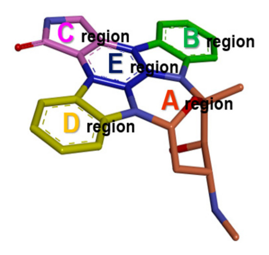Structure of staurosporine. ATP binding site of DYRK1A and GSK3β was divided into five regions (A–E) based on staurosporine’s binding mode. Various regions occupied by the ligand are highlighted in different colors (A: wheat, B: green, C: pink, D: yellow, E: blue).