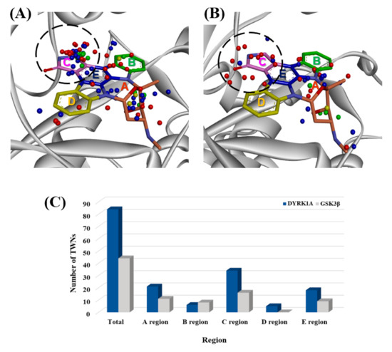 Superposition of staurosporine (pink stick model) with the center of mass of TWNs for (A) DYRK1A and (B) GSK3β. Center of masses of R3, R4, R5, and R6 TWNs are shown as red, blue, green, and yellow spheres, respectively. TWNs within the C region of the ATP binding site are highlighted with a sky-blue circle. (C) Distribution of TWNs are in various regions of the ATP binding site.