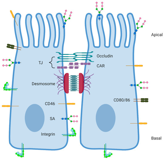 Localization of the main discussed receptors for human adenoviruses (HAdVs) on epithelial cells. Epithelial cells are polarized and contain an apical and basal side [26]. Tight junctions (TJs) and desmosomes keep the cells close together. Coxsackie and adenovirus receptor (CAR) and some other proteins like occludin make up the TJ. Desmoglein-2 (DSG-2) is part of the desmosome structure, localized below the TJ [49]. CD46 protein staining shows localization all over the cell membrane (https://www.proteinatlas.org/), but on epithelial cancer cells CD46 is found localized in between cells [8]. CD80 and CD86 are normally not expressed on epithelial cells, but on antigen presenting cells (APCs) such as dendritic cells [50]. However, some tumor cells have been shown to upregulate CD80 or CD86 [51,52]. Sialic acid (SA) residues are often the final residues on glycans and glycoproteins distributed all over the cell membrane [53]. Integrins are located all over the cell membrane in order to attach to the basement membrane, ensure cell–cell contacts, and adhere to the extracellular matrix [54,55]. Created with BioRender.com (Accessed 14 September 2020).