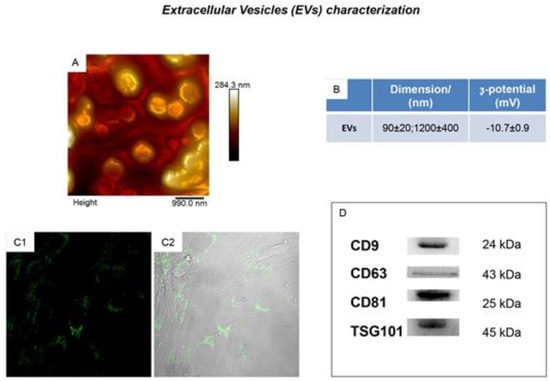Extracellular Vesicles (EVs) characterization. (A) EVs morphological analysis performed by means atomic force microscope. (B) Average size and _ζ-potential of EVs. (C1,C2) Confocal laser scanning microscopy observations of fluorescent stained EVs cultured with hOTSCs. (D) Western blot analysis showed the positivity for CD9, CD63, CD81 and TSG101. Figure published in reference [25].