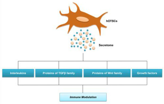 Moreover, the latest in vitro and in vivo studies on hOTSCs produced, not only a large quantity of cytokines, but also extracellular vesicles (EVs) with high content of anti-inflammatory mediators, which were important for the therapeutic strategy in several diseases [20,21], other than the regenerative capacity in the damaged tissues [22,23].