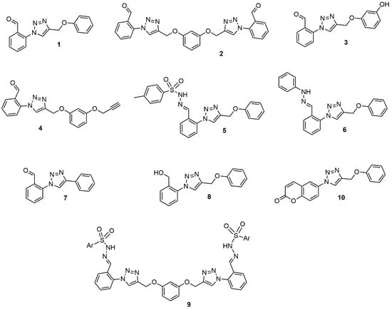 The triazole compound family is also known for its potential activity against fungi [] and trypanosomatids, such as parasites of the genus Leishmania [,]. We recently carried out the design, synthesis, and structural characterization of new 1,4-disubstituted-1,2,3-triazole compounds by copper-catalyzed azide-alkyne click chemistry reaction []; however, its antileishmanial potential has not yet been elucidated. Triazole compounds were planned to correlate the effect of the exchange of functional groups of aldehydes by classical privileged groups such as sulphonylhydrazones, hydrazones, and coumarin with anticancer and antileishmanial activity [,,]. These groups can also act in synergism with the 1,2,3-triazole nucleus and potentiate the pharmacological activity. The triazole group has interesting physical-chemical and chemical properties that can mimic the characteristics of different functional groups [,].