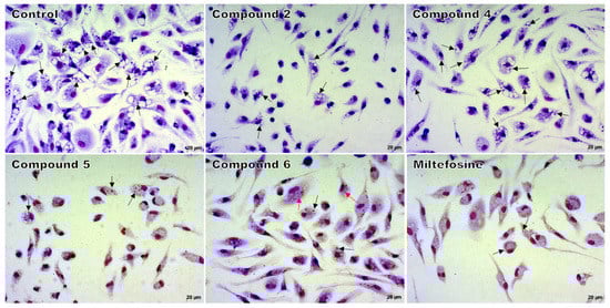 Light microscopy of macrophages infected and treated with 1,4-disubstituted-1,2,3-triazole compounds 2, 4, or 5 at 37.5 μM; with compound 6 at 18.7 μM; or with miltefosine at 25 μM. Intracellular amastigotes (black arrows) and remains of amastigotes (red arrows) inside macrophages. Giemsa, 40× objective. The images are representative of two independent experiments performed in quadruplicate.