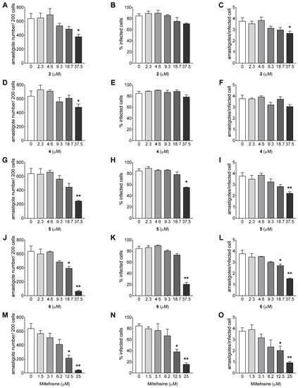 The comparison of the parameters of infection of the treated infected cells with untreated infected cells (Figure 3A–O) corroborates the activity against intracellular amastigote results. Compound 4 statistically decreased the number of amastigotes per 200 cells (p = 0.0481, Figure 3D) at 37.5 μM only, and did not significantly alter the other parameters of infection at any of the concentrations evaluated. Compound 2 decreased the number of amastigotes per 200 cells (p = 0.0193, Figure 3A) and amastigotes per infected cell (p = 0.0102, Figure 3C) at 37.5 μM, whereas compound 5 reduced all the three parameters of infection at 37.5 μM, especially the number of amastigotes per 200 cells (p = 0.0065, Figure 3G) and amastigotes per infected cell (p = 0.0070, Figure 3I). Compound 6 altered all the three parameters of infection at 37.5 μM with a remarkable reduction in the number of amastigotes per 200 cells (p = 0.0028, Figure 3J) and was still able to reduce the number of amastigotes per 200 cells (p = 0.0375, Figure 3J) and amastigotes per infected cell (p = 0.0333, Figure 3L) at 18.7 μM, demonstrating the best activity of the compounds analyzed. Miltefosine exhibited reduction of all three parameters of infection at 25 and 12.5 μM (p = 0.0024 and p = 0.0123, Figure 3M; p = 0.0013 and p = 0.0313, Figure 3N; p = 0.0036 and p = 0.0321, Figure 3O).