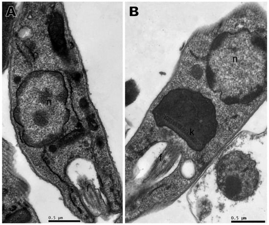 Transmission electron microscopy of Leishmania amazonensis promastigotes. (A) Untreated parasites. (B) Parasites treated for 24 h with 1,4-disubstituted-1,2,3-triazole 4 at 15.68 µM presenting kinetoplast swelling and a change in chromatin distribution. n: nucleus, f: flagellum, k: kinetoplast.