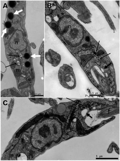 Ultrastructural alterations of Leishmania amazonensis promastigote forms treated for 24 h with 1,4-disubstituted-1,2,3-triazole 2 at 8.85 μM. (A–C) Lipid corpuscles (white arrows), an electron-dense vesicles free or within vacuoles in the cytoplasm (thin arrows), and small vacuoles near the flagellar pocket (black arrows). n: nucleus, m: mitochondria, k: kinetoplast, f: flagellum.