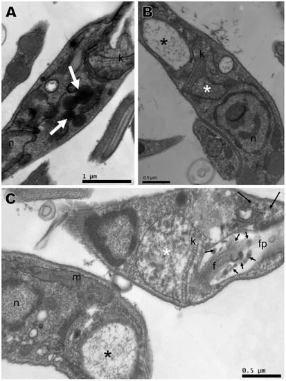 Ultrastructural alterations of Leishmania amazonensis promastigote forms treated for 24 h with 1,4-disubstituted-1,2,3-triazole 5 at 8.81 μM. (A–C) Lipid corpuscles (white arrows), filamentous electron-dense material within the vacuole (black asterisks), kinetoplast swelling with breakdown of mitochondrial cristae (white asterisks), and electron-dense material within the flagellar pocket (short thin arrows). k: kinetoplast, n: nucleus, f: flagellum, fp: flagellar pocket, m: mitochondria.