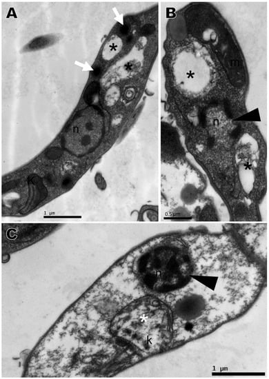 Ultrastructural alterations of Leishmania amazonensis promastigote forms treated for 24 h with 1,4-disubstituted-1,2,3-triazole 6 at 14.64 μM. (A–C) Lipid corpuscles (white arrows), large vacuoles containing electron-dense material (black asterisks), nucleus with discontinued nuclear membrane and change in the nuclear chromatin (arrowhead), and trace of kinetoplast with electron-density loss (white asterisks), loss in cytoplasm organelles. n: nucleus, k: kinetoplast, m: mitochondria.