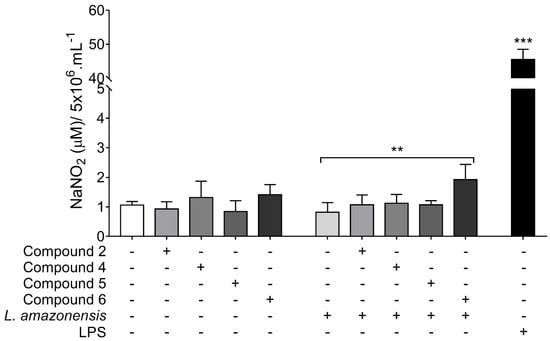 As shown in Figure 8, only BALB/c peritoneal macrophages stimulated with L. amazonensis and treated with compound 6 exhibited high nitrite levels when compared to untreated and stimulated macrophages. The nitrite level was 2.3 fold higher in macrophages stimulated and treated with compound 6 than in untreated infected macrophages.