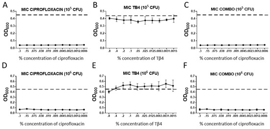 Bacterial killing for each treatment group was assessed using a MIC assay, the results of which are shown in Figure 1. When compared to untreated controls (dotted line), ciprofloxacin exhibited significant bactericidal activity for all concentrations of antibiotic (0.3–0.0006%) as compared with controls. Ciprofloxacin also appeared similarly effective against 105 as compared with 106 CFU/mL of bacteria. In contrast, all concentrations of Tβ4 remained similar to untreated controls for both concentrations of bacteria, thus, indicating a lack of bactericidal effect. Combination treatment showed similar trends to that observed for ciprofloxacin alone at both concentrations of bacteria.