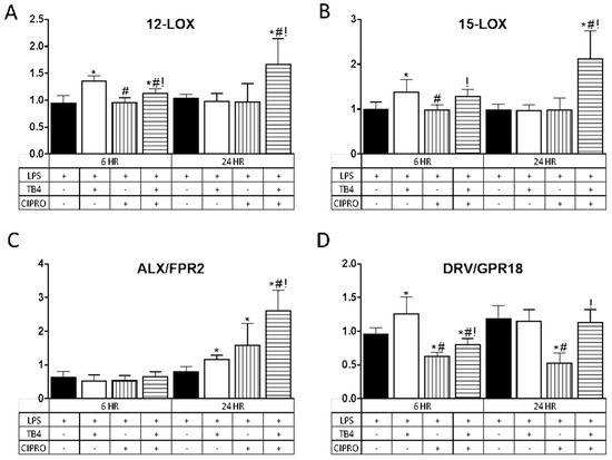 Transcript levels of select lipoxygenase enzymes (A) 12-LOX; (B) 15-LOX and specialized pro-resolving molecule (SPM) receptors (C) ALX/FPR2; (D) DRV/GPR18) in HUCLs for 6 and 24 h, after LPS stimulation (25 µg/mL) ± Tβ4 (0.1%) and ciprofloxacin (0.3%). Results are reported as relative fold change of the gene of interest, normalized to β-actin ± SD. n = 3/group/timepoint. * p < 0.05 vs. LPS, # p < 0.05 vs. Tβ4, ! p < 0.05 vs. ciprofloxacin.