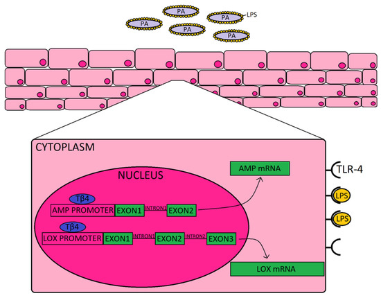 Schematic representation of how Tβ4, as an adjunct to ciprofloxacin may be enhancing the corneal epithelial cell response to Pseudomonas (purple) and LPS (yellow) binding to TLR4. It is proposed that Tβ4 (blue) may act as a transcription factor that is shown to bind to the promoter region, as indicated by the generalized representation shown for both AMPs (and related molecules) and lipoxygenase enzymes.