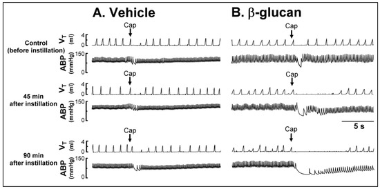 Experimental records illustrating the pulmonary chemoreflex responses to right-atrial injection of capsaicin (Cap, 1 μg/kg; arrows) before, 45 min after, and 90 min after intratracheal instillation of (A) vehicle (isotonic saline) or (B) β-glucan (5 mg/0.1 mL/rat) in two anesthetized, spontaneously breathing rats (vehicle: 305 g; β-glucan: 310 g). VT, tidal volume; ABP, arterial blood pressure. Please note that the pulmonary chemoreflex responses evoked by capsaicin were enhanced by the β-glucan instillation, but not altered by the vehicle instillation.