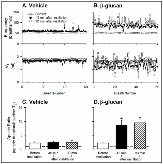 Effects of intratracheal instillation of β-glucan or its vehicle on the baseline breathing pattern and apneic response to right-atrial injection of capsaicin in two groups of anesthetized, spontaneously breathing rats. (A,B): effects of intratracheal instillation of vehicle or β-glucan on the baseline frequency and VT, respectively; (C,D): effects of intratracheal instillation of vehicle or β-glucan on the apneic responses to capsaicin injection, respectively. The apneic ratio was defined as the apneic duration occurring during 20 s after the capsaicin injections divided by the baseline expiratory duration (TE). Data are means ± SE (n = 6). One-way ANOVA followed by Newman-Keuls post hoc test: *, significantly different from before instillation (p < 0.05). Please note that the β-glucan instillation caused an irregular baseline breathing pattern, characterized by high respiratory frequency and unstable VT; β-glucan also enhanced the apneic responses.
