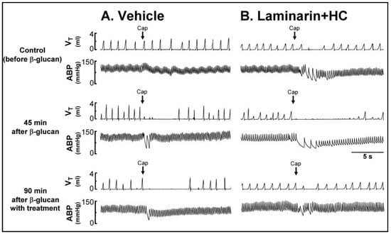 Experimental records illustrating the effect of treatment with (A) vehicle or (B) Laminarin (10 mg/kg, iv) + HC (8 mg/kg, iv) on the β-glucan-induced enhancement of pulmonary chemoreflex responses triggered by capsaicin injection (Cap, 1 μg/kg; arrows) in two anesthetized, spontaneously breathing rats (vehicle: 340 g; Laminarin + HC: 325 g). VT, tidal volume; ABP, arterial blood pressure. See the legend of Figure 1 for further explanation. Please note that the β-glucan-induced enhancement of pulmonary chemoreflex responses was abolished with Laminarin + HC treatment. HC, HC-030031.