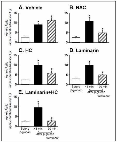 Effects of treatment with (A) vehicle, (B) NAC (0.3 g/kg, iv), (C) HC (8 mg/kg, iv), (D) Laminarin (10 mg/kg, iv) and (E) Laminarin + HC on the β-glucan-induced enhancement of pulmonary chemoreflex responses triggered by capsaicin injection in anesthetized, spontaneously breathing rats. Data are means ± SE (n = 6). One-way ANOVA followed by Newman-Keuls post hoc test: *, significantly different from before β-glucan (p < 0.05); #, significant difference when corresponding data between without and with treatment were compared (p < 0.05). NAC, N-acetyl-L-cysteine; HC, HC-030031.