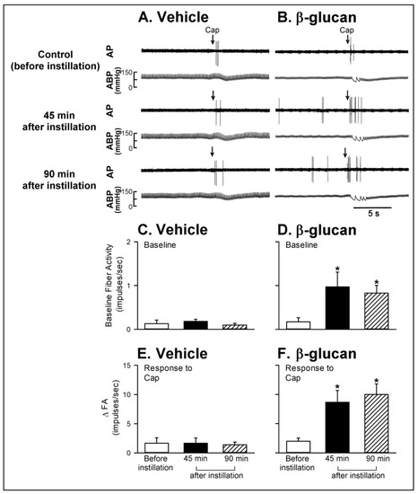 Experimental records illustrating the responses of capsaicin-sensitive lung vagal (CSLV) afferents to right-atrial injection of capsaicin (Cap, 0.75 μg/kg; arrows) before, 45 min after, and 90 min after intratracheal instillation of vehicle or β-glucan in anesthetized, artificially ventilated rats. (A,B): intratracheal instillation of vehicle or β-glucan (5 mg/0.1 mL/rat) in two anesthetized, artificially ventilated rats (vehicle: 350 g; β-glucan: 355 g), respectively. AP, action potential; ABP, arterial blood pressure. (C,D): the effects of vehicle and β-glucan on the baseline fiber activity of CSLV afferents, respectively. (E,F): the effects of vehicle and β-glucan on the responses of CSLV afferents to the capsaicin injection, respectively. FA, fiber activity; ∆FA, increase in the fiber activity was measured as the difference between peak FA (averaged over 3-s intervals) and the baseline FA (averaged over 10-s intervals) in each CSLV afferent. Data are means ± SE (n = 8). One-way ANOVA followed by Newman-Keuls post hoc test: *, significantly different from before instillation (p < 0.05). Please note that the β-glucan instillation caused an elevation in baseline FA; furthermore, the ∆FA triggered by capsaicin injection was also enhanced by β-glucan instillation.