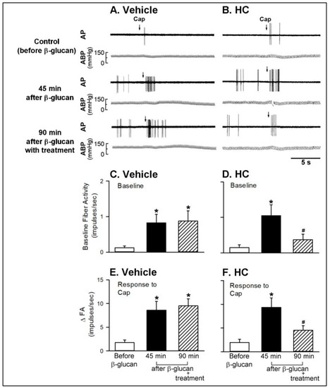 Experimental records illustrating the effects of treatment of vehicle or HC-030031 (HC, 8 mg/kg) on the β-glucan-induced potentiating on the responses of capsaicin-sensitive lung vagal (CSLV) afferents to capsaicin (Cap, 0.75 μg/kg; arrows) after intratracheal instillation of β-glucan (5 mg/0.1 mL/rat) in anesthetized, artificially ventilated rats. (A,B): treatment with vehicle or HC in two anesthetized, artificially ventilated rats (vehicle: 300 g; β-glucan: 290 g), respectively. AP, action potential; ABP, arterial blood pressure. (C,D): the effects of vehicle and HC on the β-glucan-induced elevation of the baseline fiber activity of CSLV afferents, respectively. (E,F): the effect of vehicle and HC on the β-glucan-induced potentiating on the responses of CSLV afferents to the capsaicin injection, respectively. FA, fiber activity. Data are means ± SE (n = 8). See the legend of Figure 6 for further explanation. One-way ANOVA followed by Newman-Keuls post hoc test: *, significantly different from before β-glucan (p < 0.05); #, significant difference when corresponding data between without and with treatment were compared (p < 0.05). Please note that the HC treatment abolished the β-glucan-induced elevation of the baseline fiber activity of CSLV afferents; furthermore, the β-glucan-induced potentiating of the ∆FA of CSLV afferents triggered by capsaicin injection was also abrogated by HC treatment.