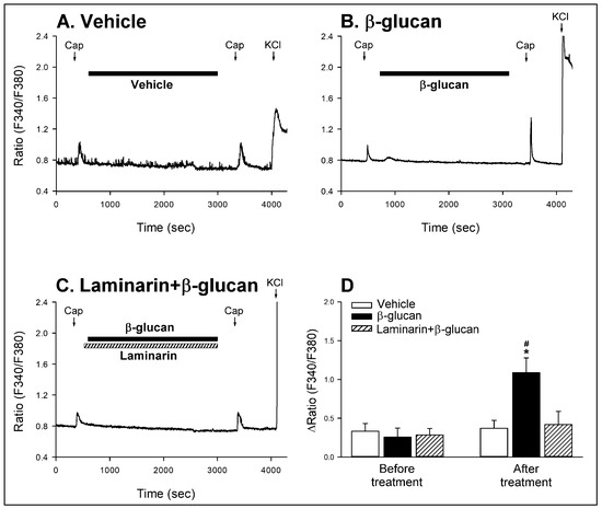 Series 2. To determine the role of Dectin-1 receptors, the β-glucan-induced potentiation of capsaicin-evoked Ca2+ transients were determined after the pretreatment of Laminarin. After pretreatment with Laminarin (Figure 8C,D), the β-glucan-induced hypersensitivity of CSLV neurons was largely reduced: the responses of ∆ratio of Ca2+ transient were 0.29 ± 0.08 (F340/F380) and 0.42 ± 0.17 (F340/F380) before and after Laminarin + β-glucan perfusion, respectively (Figure 8D, p > 0.05; n = 22). Moreover, the Laminarin alone did not influence the capsaicin-induced Ca2+ transient: the ∆ratios induced by capsaicin before and after Laminarin alone were 0.34 ± 0.12 and 0.36 ± 0.17 (F340/F380), respectively (p > 0.05; n = 11).