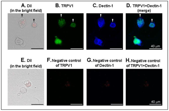 Representative photographs of triple-labeling immunofluorescence of DiI, TRPV1, and Dectin-1 in the lung vagal neurons. (A,E): DiI labeling in red in the bright field was served as positive control; (B) TRPV1 staining in green; (C) Dectin-1 staining in blue; (D) the merged image; (F–H): negative control of TRPV1, Dectin-1, and TRPV1 + Dectin-1, respectively. We used bovine serum albumin to demonstrate specific binding of primary antibody. Arrowheads are added to depict co-localization of DiI labeling, TRPV1 staining, and Dectin-1 staining in the same neurons. Scale bar, 40 μm.