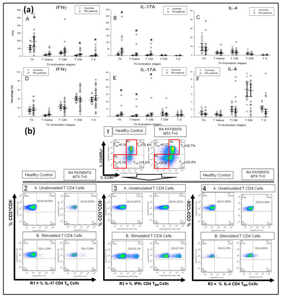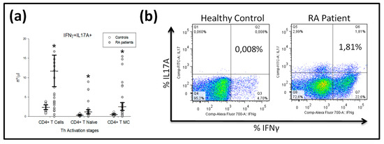 ) healthy controls. All values are expressed as the mean cell numbers ± S.E.M. *, p < 0.05 for RA patients vs. healthy controls. (b) Dot plots represent the percentages of IFNγ+IL-17A+ double-positive expression by CD4+ T-lymphocytes after in vitro PMA stimulation in two representative situations: a healthy control and a RA patient at baseline before MTX treatment.