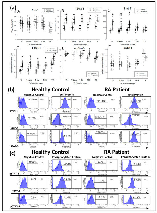 ) healthy controls. All values are expressed as the mean MFI or percentage ± S.E.M. *, p < 0.05 for RA patients vs. healthy controls. (b) Histograms represent the mean fluorescence intensity (MFI) of STAT-1, STAT-3 and STAT-6 total protein stimulated with IFNγ, IL-6 and IL-4, respectively, and their negative controls, in two representative cases: a healthy control and a RA patient at baseline before MTX treatment. (c) Histograms represent the percentages of STAT-1, STAT-3 and STAT-6 phosphorylation stimulated with IFNγ, IL-6 and IL-4, respectively, and their negative controls in two representative cases: a healthy control and an RA patient at baseline before MTX treatment.