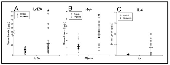 ) as healthy controls (panels A, B and C). All values are expressed as the mean serum levels ± S.E.M. *, p < 0.05 for RA patients vs. healthy controls.