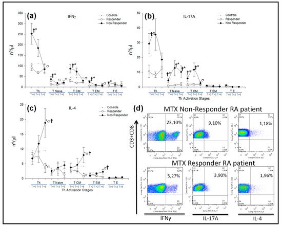). All values are expressed as the mean cell numbers (nº/μL) ± S.E.M. *, p < 0.05 for responder or nonresponder RA patients vs. healthy controls; †, p < 0.05 for responders vs. nonresponders, σ p < 0.05 for 6 months of follow-up time vs. baseline. (d) Dot plots represent the percentages of IFNγ+, IL-17A+ and IL-4+ expression by CD4+ T-lymphocytes after in vitro PMA stimulation in two representative situations: a nonresponder and a responder RA patient at baseline before MTX treatment.