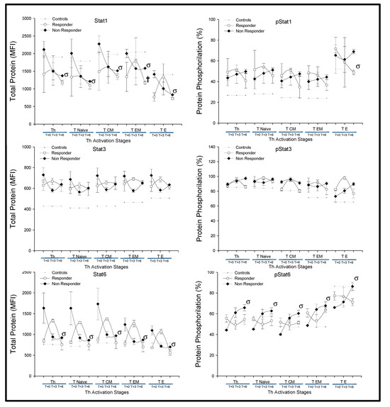 The spontaneous and stimulated CD4+T-lymphocyte subset expression of STAT-1, STAT-3 and STAT-6 was assessed by in vitro phosphoprotein intracytoplasmic staining. To evaluate STAT-1, STAT-3 and STAT-6 phosphorylation, PBMCs were stimulated for 15′ with 40.000 U/mL of IFNα for STAT-1, 0.1μg/mL of IL-6 for STAT-3 and 0.1 μg/mL of IL-4 for STAT-6. Additionally, the total STAT-1, STAT-3 and STAT-6 protein was analyzed in CD4+T-lymphocyte subsets.