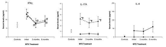 Finally, we also investigated the serum levels of IL-17A, IFNγ and IL-4 in RA patients before and during the initial 6 months of treatment. Significantly increased levels of IL-17A were detected in MTX nonresponders with respect to responders under basal conditions and during the six months of treatment follow-up. Bot, MTX responder and nonresponder patients showed similar basal levels and significant reductions in IFNγ levels during the 6 months of MTX treatment. IL-4 serum levels were significantly increased in MTX nonresponders with respect to MTX responders before and during the 6 months of treatment (Figure 7).
