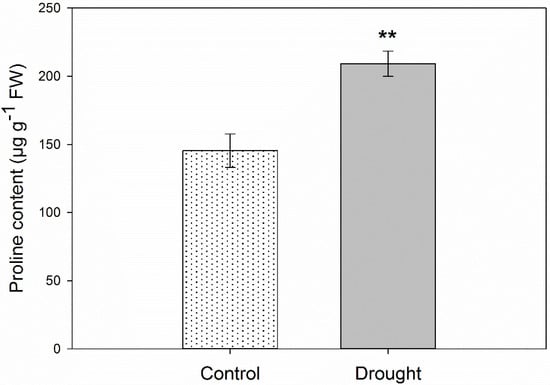 Soil drought stress increases proline content in flower abscission zone (AZ) of yellow lupine. Lupines were cultivated under water deficit conditions (25% WHC), while control plants were grown in the soil of optimal moisture (70% WHC). For analysis, sections of the abscission zone (AZ) were collected on the 48th day of cultivation. Data are presented as averages ± SE (n = 3). Significant differences in stressed plants in comparison to control are ** p < 0.01 (Student’s t-test).