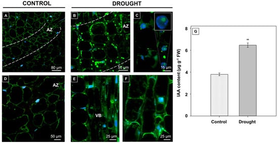 Drought stress affects indole-3-acetic acid (IAA) localization in abscission zone (AZ) cells. Immunolocalization of IAA in the floral AZ of yellow lupine exposed to drought-stress (25% WHC, water deficit conditions) (B,E,F) and AZ from control plants growing in the soil of optimal moisture (70% WHC) (A,B). Green fluorescence indicates IAA presence, whereas blue labeling corresponds to nuclei stained with DAPI. AZ area is marked by a white dotted line (A,B). Image (D) presents the magnified control AZ area presented in (A). IAA is found in nuclei (C insert) and cells located near the vascular bundles (VB) (E,F). Bars are given in each image. Endogenous content of IAA in control and drought-treated AZs (G). For all analysis, sections of AZs were collected on the 48th day of cultivation. Data are presented as averages ± SE (n = 3). Significant differences in the stressed plants in comparison to control plants are ** p < 0.01 (Student’s t-test).