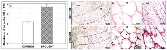 Drought causes changes in pectin distribution in floral abscission zone (AZ) of yellow lupine. Lupines were cultivated under water deficit conditions (25% WHC), while control plants were grown in the soil of optimal moisture (70% WHC). Sections of floral AZs were collected on the 48th day of cultivation. The total content of pectin based on pectin absorbance (A). Data are presented as averages ± SE (n = 3). Significant differences in the stressed plant in comparison to control plants are ** p < 0.01 (Student’s t-test). De-esterified pectin staining using Ruthenium red in the control AZ (B–D) and drought-stressed (E–G). AZ area is marked by the black dotted line (B,E). Arrowheads indicate the place of de-esterified pectin accumulation. Abbreviation: VB—vascular bundles. Bars are given in each image.