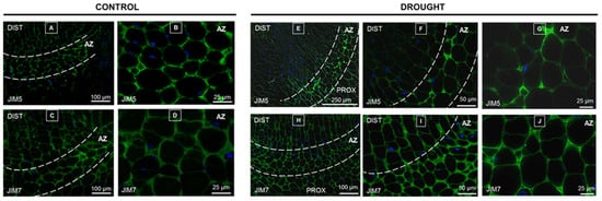 We used specific antibodies to detect low- (31–40%) and non-methylated HGs (JIM5), as well as high-methylated (15–80%) HGs (JIM7) []. The immunocytochemical analysis showed a differential distribution of both types of pectin in the flower AZ of plants subjected to drought stress (Figure 4E–G) and in control AZ sections (Figure 4A,B). Importantly, drought conditions caused an accumulation of low-methylated HGs only specifically in the AZ cells (Figure 4E,F). In this case, the JIM5 signal was almost non-detectable in distal and proximal parts of the AZ area (Figure 4E–G). On the other hand, when plants were cultivated under optimal soil water content, the JIM5 signal was visible in the cell walls within the AZ area (Figure 4A,B), as well as above and below this structure (Figure 4A). High-methylated HGs were accumulated stronger in the drought-induced AZ (Figure 4H–J) compared to the control one (Figure 4C,D). The JIM7 signal was noted also in the distal and proximal AZ areas of both drought-treated (Figure 4H–J) and control plants (Figure 4C,D).