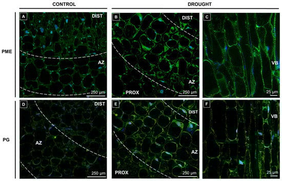 Drought influences the presence of pectin remodeling enzymes in the abscission zone (AZ) area. The impact of soil drought stress (25% WHC, water deficit conditions) on the localization of pectin-methylesterase (PME) (B,C) and polygalacturonase (PG) (E,F) was analyzed in the flower AZ of yellow lupine. Control was AZs excised from plants growing in the soil of optimal humidity (70% WHC) (A,D). For analysis, sections of AZs were collected on the 48th day of cultivation. Fixed material was dissected and incubated with monoclonal anti-PME-Ab (A–C) and anti-PG-Ab (D–F). Green fluorescence indicates the presence of the enzymes. Nuclei were stained with DAPI (blue fluorescence). AZ area is marked by white dotted lines (A,B,D,E). Abbreviations: DIST—a distal region of AZ, flower pedicel fragment above the AZ, PROX—a proximal region of AZ, stem fragment below the AZ, VB—vascular bundles. Bars are given in images.