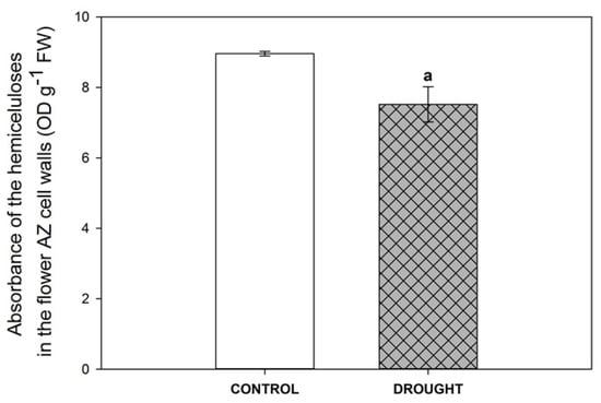 Hemicellulose content is negatively regulated by soil water deficit. The effect of drought stress (25% WHC, water deficit conditions) on the absorbance of hemicelluloses in the flower abscission zone (AZ) of yellow lupine was analyzed. Control AZ fragments were collected from plants growing in the soil of optimal conditions (70% WHC). For analysis, sections of AZs were harvested on the 48th day of cultivation. Data are presented as averages ± SE (n = 3). Significant differences in the stressed plants in comparison to control plants are a p < 0.05 (Student’s t-test).