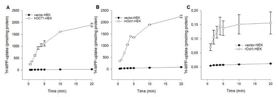 Time dependent uptake of 3H-MPP in (A) hOCT1-, (B) mOct1-, and (C) rOct1-HEK293 cells. Human, mouse, and rat organic cation transporter 1 (OCT1) transfected HEK293 cells were incubated for increasing time points at 37 °C in the presence of labeled 3H-1-methyl-4-phenylpyridinium (MPP) (2 nM), in case of hOCT1 and mOct1 the concentration was filled up to 10 µM with unlabeled MPP. Each data point represents the mean of two or three independent experiments ± average deviation. Experiments were carried out in triplicates.