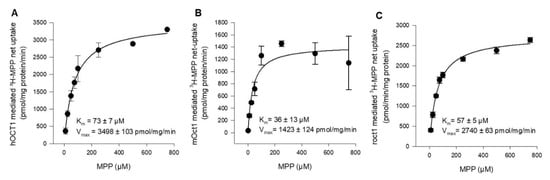 To determine and compare the affinity of hOCT1, mOct1, and rOct1 in the same expression system and under the same experimental conditions, concentration-dependent MPP uptake was conducted. In transporter-transfected and vector-transfected HEK293 cells, we measured the uptake of MPP in a transport buffer containing 2 nM [3H]-labeled MPP in the presence of increasing concentrations of non-labeled MPP. The Km value of hOCT1, mOct1, and rOct1 were determined to be 73 ± 7 µM, 36 ± 13 µM, and 57 ± 5 µM, as shown in Figure 2A–C, respectively. The substrate turnover calculated as the Vmax value of mOct1 (1423 ± 124 pmol/mg/min) and rOct1 (2740 ± 63 pmol/mg/min) was inconsiderably (<2.5-fold difference) lower than the Vmax value of hOCT1 (3498 ± 103 pmol/mg/min) for MPP.