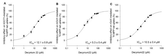 Decynium22 is a well-known, high-affinity inhibitor of OCT1, OCT2, and OCT3 [2,17,18]. To our knowledge, there are no systematical studies under the same conditions to evaluate the concentration-dependent inhibition of hOCT1, mOct1, and rOct1 by decynium22. For further functional characterization and comparison of the three species, the inhibitory potential of the increasing decynium22 concentrations on OCT1-mediated uptake of MPP was measured, and the IC50 value of decynium22 for hOCT1, mOct1, and rOct1 was calculated to be 12.1 ± 0.8 µM, 5.3 ± 0.4 µM, and 10.5 ± 0.4 µM (Figure 3).