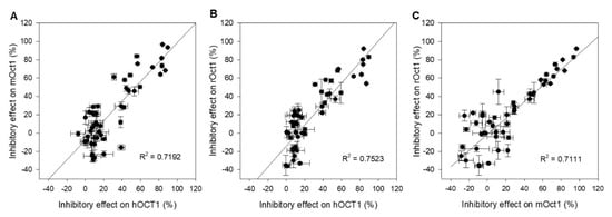 Scatter plot analysis correlating inhibitory effects of (A) hOCT1 and mOct1, (B) hOCT1 and rOct1, and (C) mOct1 and rOct1. The correlation coefficient R2 value for all three combinations is higher than 0.7, indicating a good correlation between species. Data points represent mean and standard deviation of one individual experiment. Mean values in detail are presented in Table 1 and Table 2.