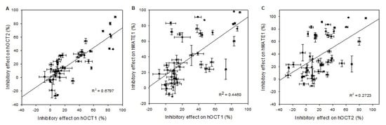 Scatter plot analysis correlating inhibitory effects of (A) hOCT1 vs. hOCT2, (B) hOCT1 vs. hMATE1, (C) and hOCT2 vs. hMATE1. The correlation coefficient R2 value for the combination hOCT1 vs. hOCT2 is near 0.7, indicating a good correlation between cation transporters, while the combination hOCT1 vs. hMATE1 shows only an R2 value of 0.45 and for hOCT2 vs. hMATE1 R2 = 0.27. Data points represent mean and standard deviation of one individual experiment. Mean values are presented in detail in Table 3 and Table 4.