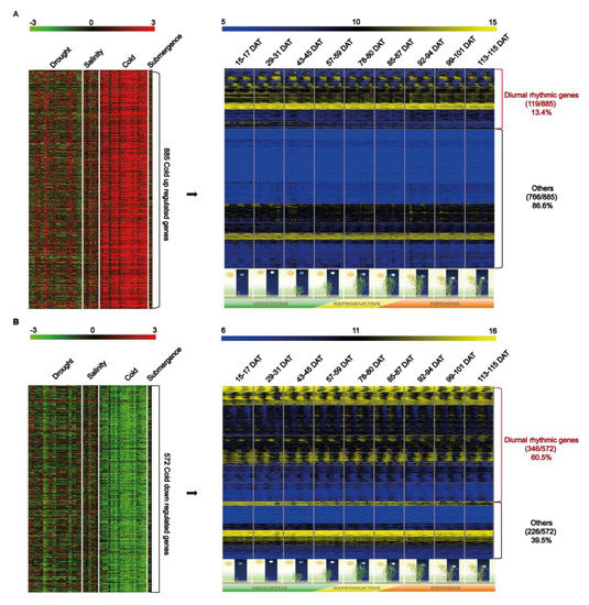 Heat map of cold-regulated genes with diurnal rhythmic expressions. (A) Overview of the process that identified 885 cold-upregulated genes, 119 of which were shown to have diurnal rhythmic expression. (B) Overview of the process that identified 572 cold-downregulated genes, 346 of which were shown to have diurnal rhythm expression. Cold-responsive diurnal rhythm genes are indicated in red. DAT means days after transplanting [22].