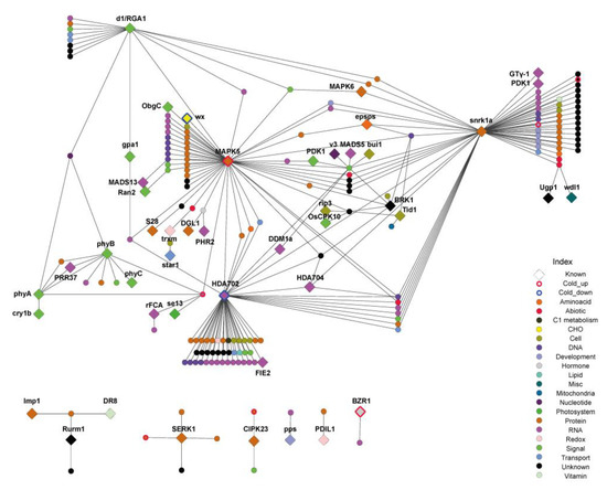 To further explore the molecular mechanisms regulating crosstalk between the circadian clock and cold stress response, we constructed a hypothetical protein–protein interaction (PPI) network of up/downregulated CD genes using a rice interaction viewer (http://bar.utoronto.ca/interactions/cgi-bin/rice_interactions_viewer.cgi) [52]. This viewer generated a network of CD genes comprising 764 nodes and 1340 edges (Figure S2). However, owing to its complexity, we reconstructed the network to only show the interactions between genes for which some information was available. The reconstructed network comprised 208 nodes and 248 edges (Figure 3, Table S5), including both up- and downregulated CD genes.