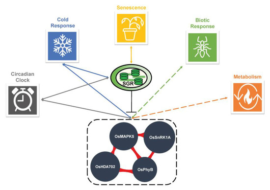 Our network analysis suggests a hypothetical molecular mechanism underlying the diverse phenomenon related to crosstalk between cold stress response and circadian clock regulation. In this network, OsPhyA, OsPhyB, OsPhyC, and OsPRR37 are key components associated with the regulation of circadian clock. These components interact with both OsMAPK5, a component of Ca2+ signaling and modulator of disease resistance that is upregulated in response to cold and exhibits diurnal rhythmic expression, and OsHDA702, a component of DNA remodeling that is downregulated in response to cold and exhibits rhythmic expression [44,105]. OsSnRK1a has roles in regulating various metabolism-related processes in plants and is also related to ABA signaling [106,107]. Moreover, D1/RGA1 is related to these four hub genes. Studies of daikoku 1 (d1) mutant using microarray analysis revealed that D1/RGA1 has a role in regulating multiple abiotic stresses, including drought, cold, heat, and salinity [108]. Angel et al. (2016) also revealed decreased drought sensitivity in the erect leaves of d1 mutant owing to the increased photo-avoidance and more effective light harvesting [109,110]. More interestingly, sgr mutant with cold tolerant phenotype is exhibited as erect leaves which is similar to d1 mutant, and the expression level of four hub genes are all upregulated in sgr mutant relative to wild type. Thus, the identification of these components implies that cold-induced SGR and four hub genes (OsMAPK5, OsSnRK1a, OsHDA702, and OsPhyB) might coregulate the physiological response to cold in a circadian clock-dependent manner.